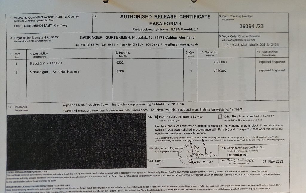 | Betriebszeit: | 2835 Std / 1530 Starts ( Stand 29.04.2024 wird noch geflogen ) |